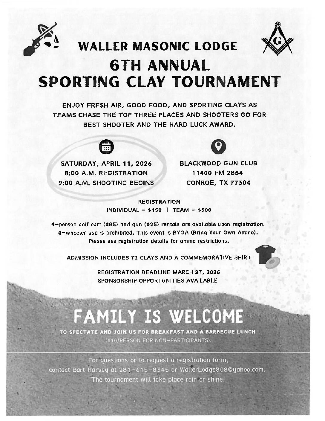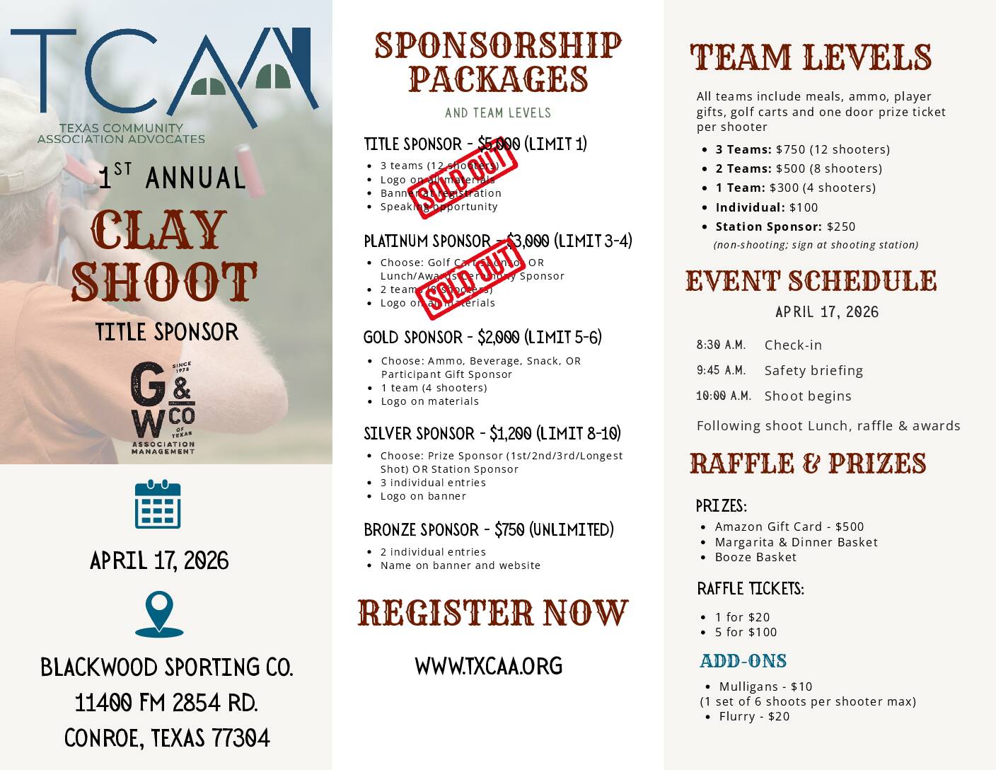 Blackwood Gun Club 11400 FM 2854, Conroe, TX, United StatesTexas Community Association Advocates Registration: 8:30am Shotgun Start: 10:00am Register HERE!