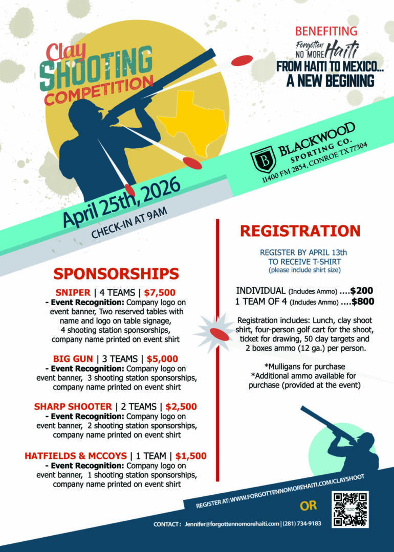 Blackwood Gun Club 11400 FM 2854, Conroe, TX, United StatesForgotten No More Haiti - A Home to Call their Own Fund Registration @ 9AM Shotgun start @ 10AM Lunch @ 12PM To Register: Scan the QR code or Click […]
