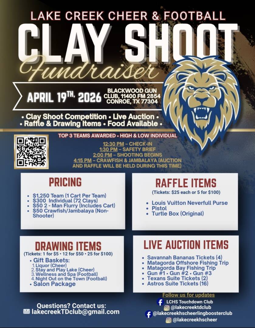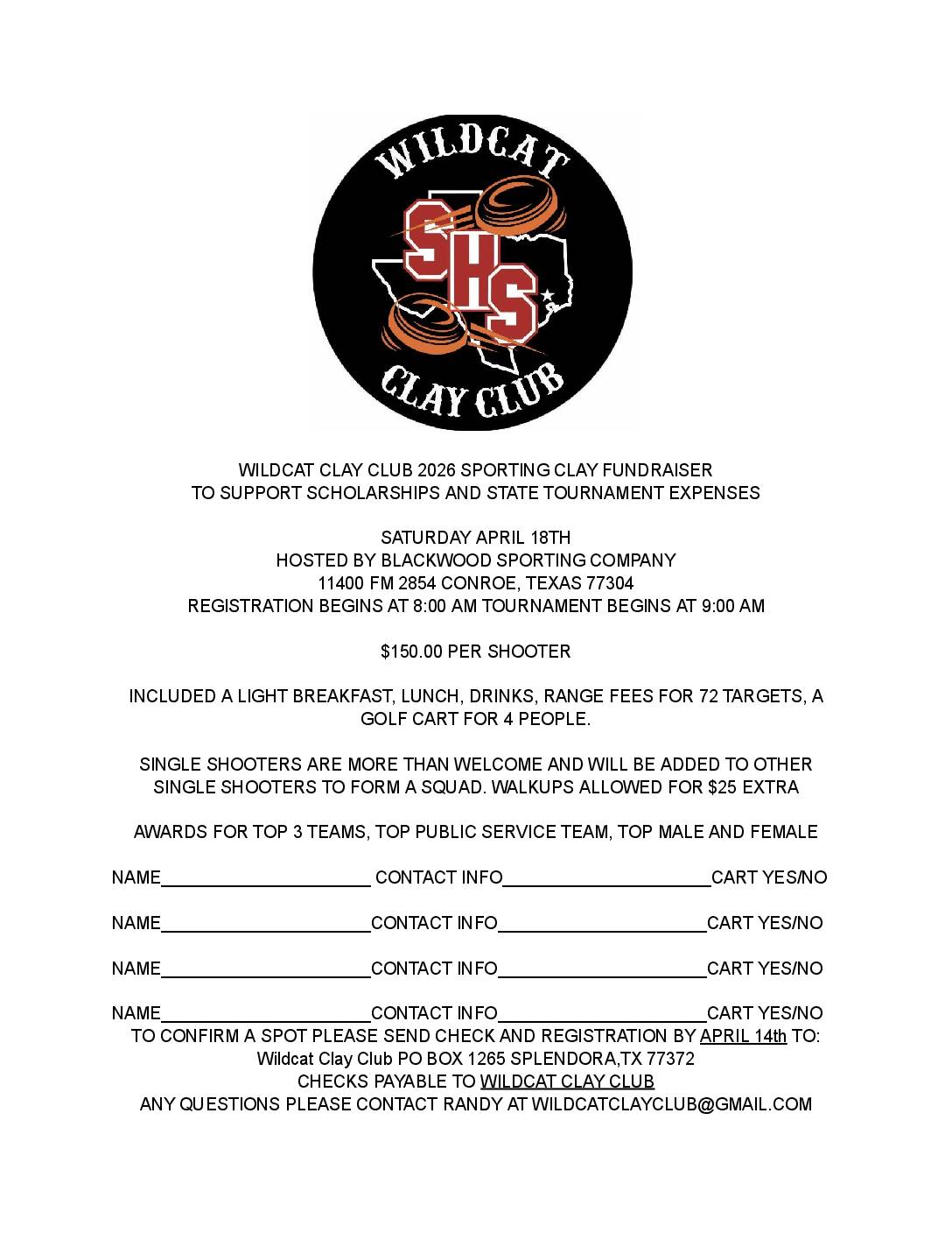 Blackwood Gun Club 11400 FM 2854, Conroe, TX, United StatesTo support our club going to state tournament and scholarship. Registration @8am Shotgun Start @9am Lunch @11:30am followed by awards **Black Course Open to Public